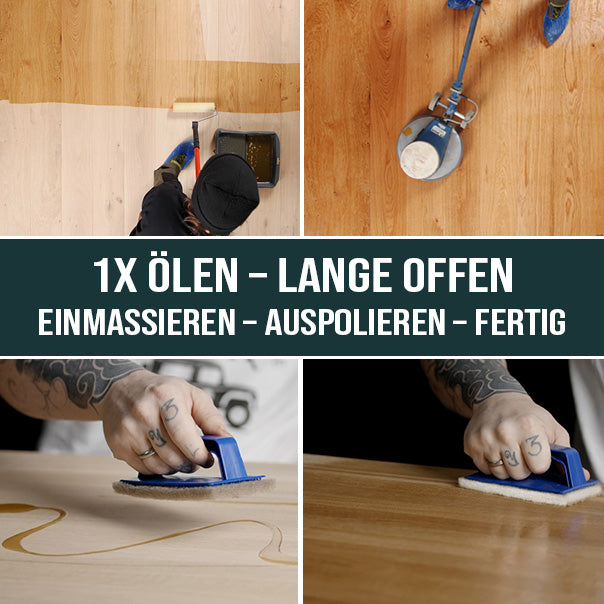 - Das Öl mit Pinsel, Rolle oder beigem Pad dünn und gleichmäßig auftragen.